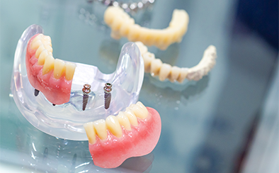 顎の骨に埋め込んだインプラント体を支えに、総入れ歯を安定させる治療法です。硬いものを食べるときも、しっかりとした噛み心地を得られます。
