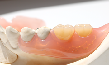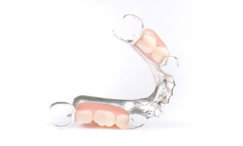 床の部分に金属を使用した入れ歯です。レジンに比べて床を薄く作れるため、お口に馴染みやすく、硬いものも噛みやすいのが特徴です。当院では、コバルトクロムとチタンの2種類の金属から、患者さまに合わせて選択しています。