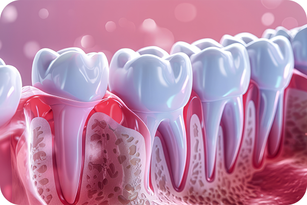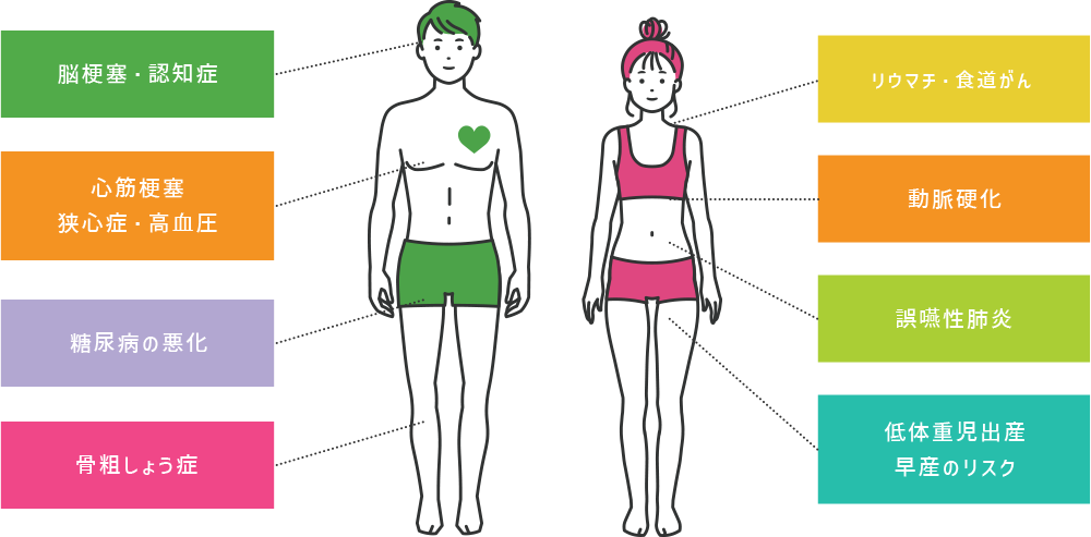 歯周病は、日本人が歯を失う主な原因のひとつです。成人の約8割がかかっているといわれており、進行すると歯を支える骨にダメージが生じ、最終的には歯を失うことにつながります。初期の段階ではほとんど自覚症状がないため、気づかないうちに進行してしまうこともあります。大切な歯を守るためには、正しい歯みがき習慣と歯科医院での定期検診を習慣にすることが大切です。